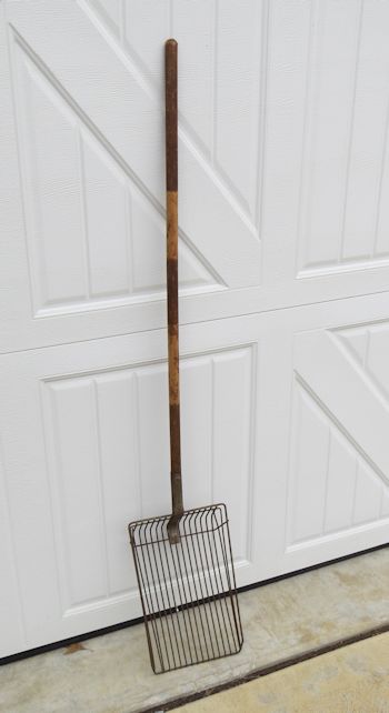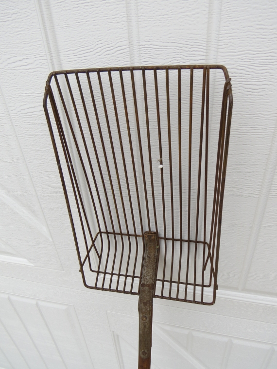 This tool is some type of wire basket/scoop with a long wood handle. It is about 54" tall.